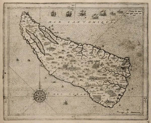 - Île d’Oléron : La carte de 1586 ou 1587 détaille la production de sel, avec des salines clairement identifiées.